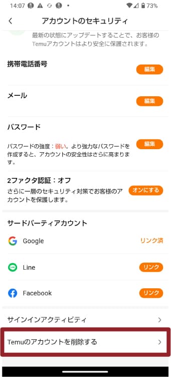 - ページ下の「Temuアカウントを削除する」をクリック、画面の指示に従いアカウントを削除する。