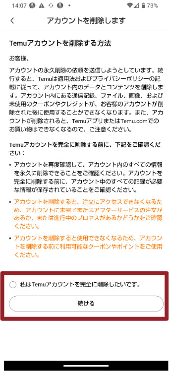 - 「私はtemuアカウントを完全に削除したいです」にチェックを入れ、「続ける」をタップ、画面の指示に従いアカウントを削除する。